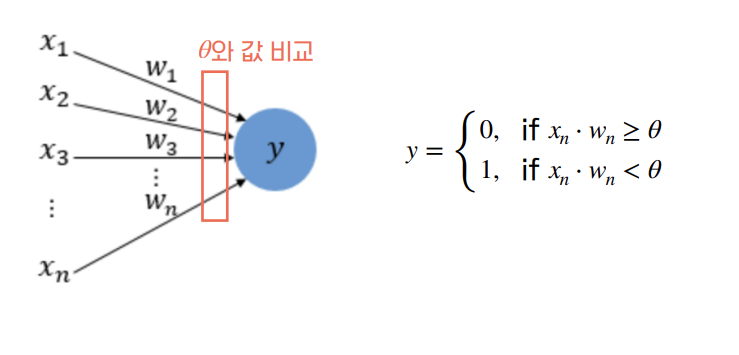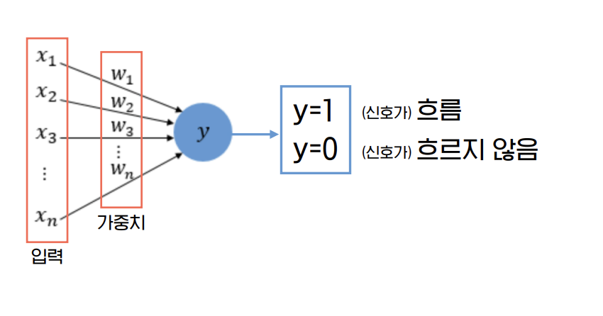 x1...xn는 입력 신호, y는 출력 신호, w1...wn(weight)는 가중치를 뜻한다.