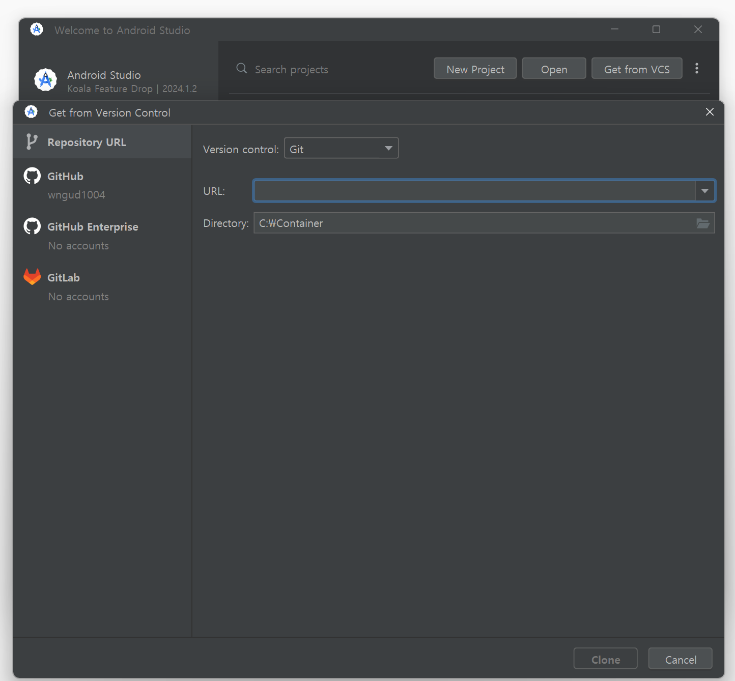 Get from Version Control 창으로 넘어왔다면 레포지토리를 불러와야 한다.