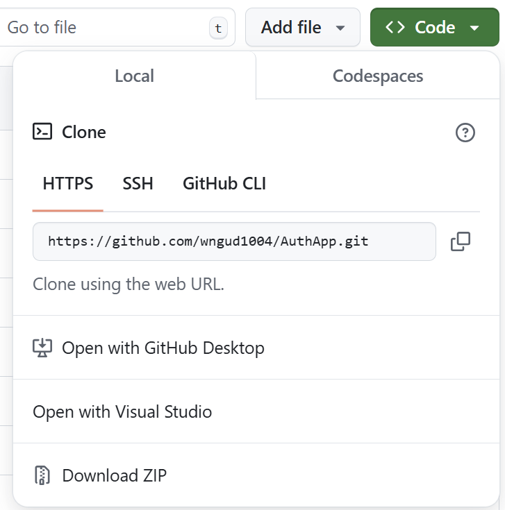 원하는 레포지토리에 들어가 Code라고 적혀있는 초록색 버튼을 클릭하고 나오는 HTTPS 탭에서 URL를 복사한다.