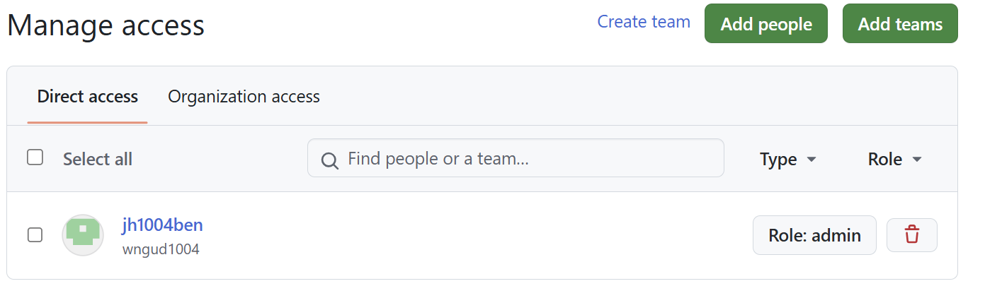 7번까지 모두 해보고 해결이 되지 않아 팀 내 권한을 Owner로 다시 받고 레포지토리로 돌아가 Manage access도 해줬다.
