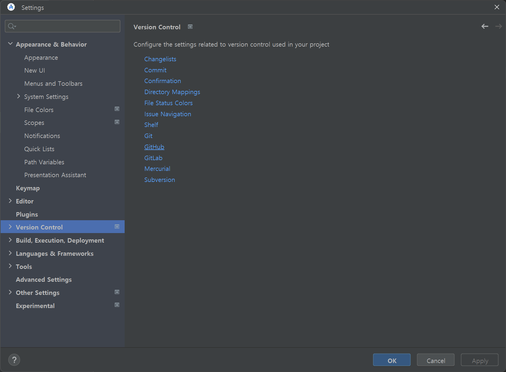 Settings 창이 나올텐데 여기서 Version Control 를 선택한다.