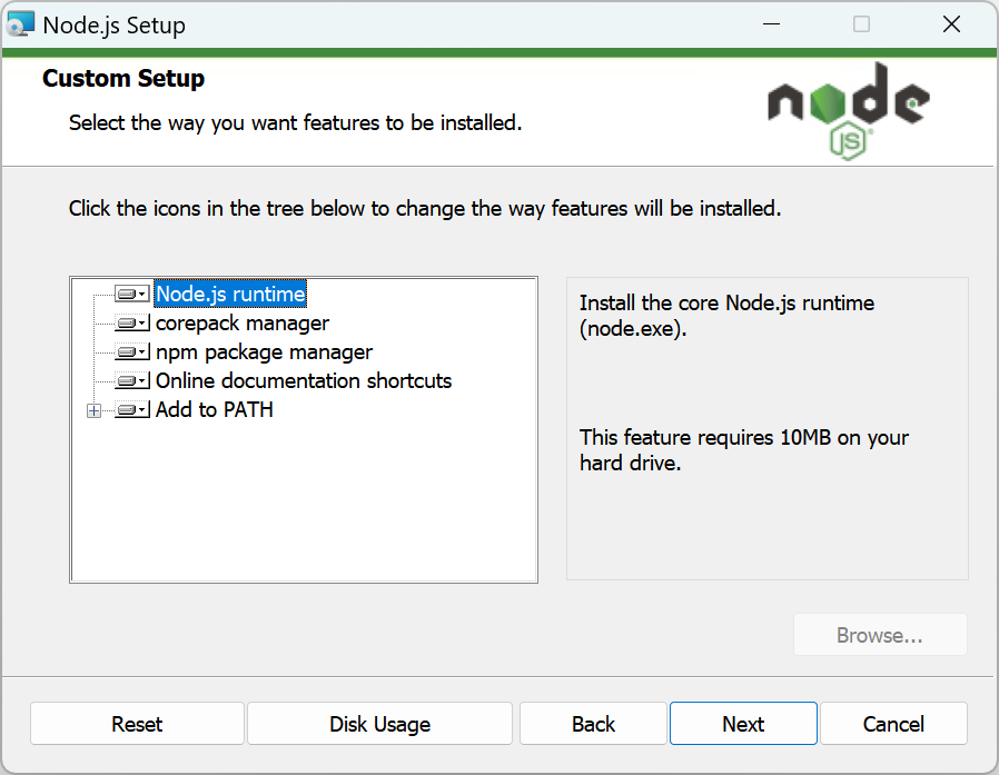 - Node.js의 핵심 런타임을 설치하는 옵션이다.