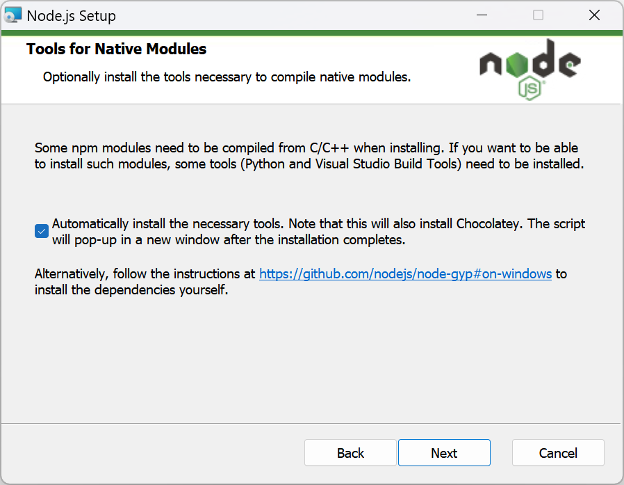 이를 위해 일부 도구(Python과 Visual Studio Build Tools 등)의 소프트웨어가 필요하다.