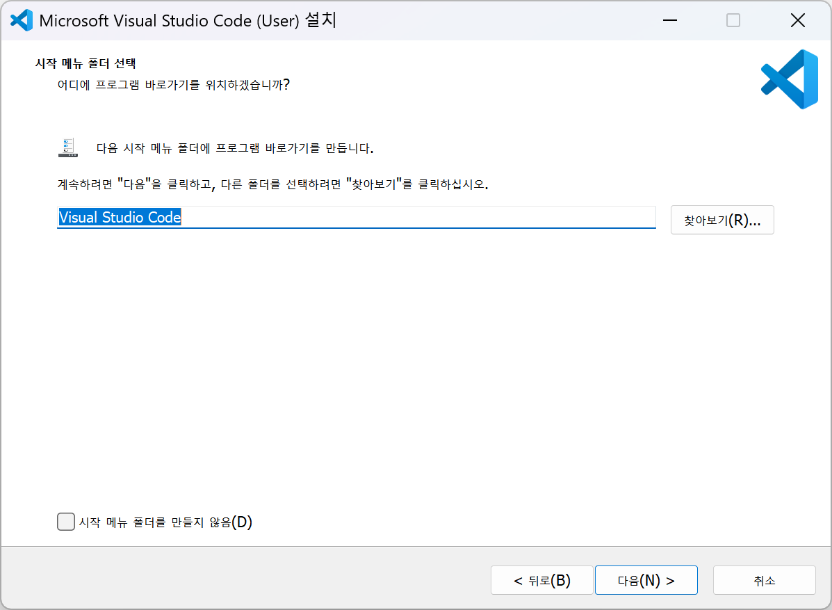 3. 시작메뉴 폴더를 선택하고 다음(N: Next) 버튼을 클릭한다.