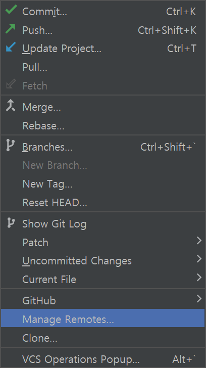 Git 메뉴를 선택하면 나오는 하위 메뉴 중 Manage Remotes... 를 선택한다.