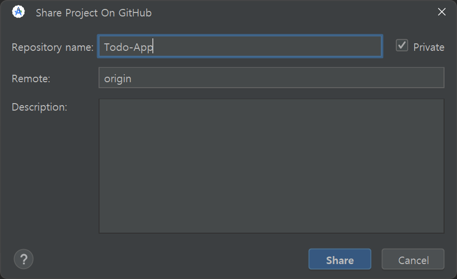 물론 위에 GitHub를 선택해서 Share Project on GitHub를 누른다면