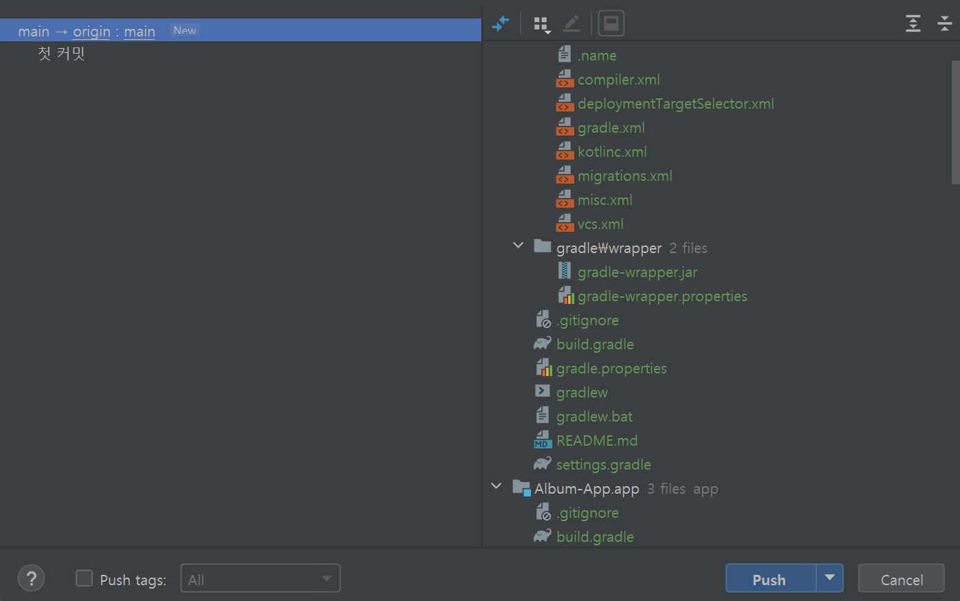 기본으로 현재 모든 파일이 선택되어 있고 기본 메시지는 Initial commit이라고 되어있다.