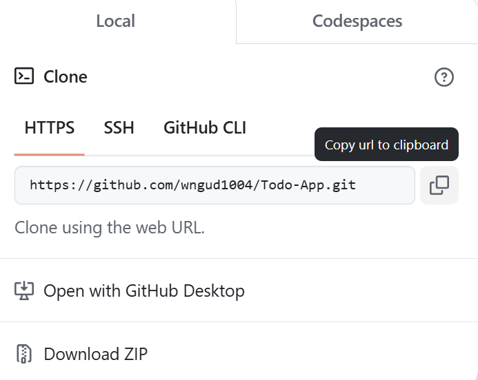 레포지토리를 만들고 들어가 초록색 Code라고 쓰여있는 부분을 클릭한다.