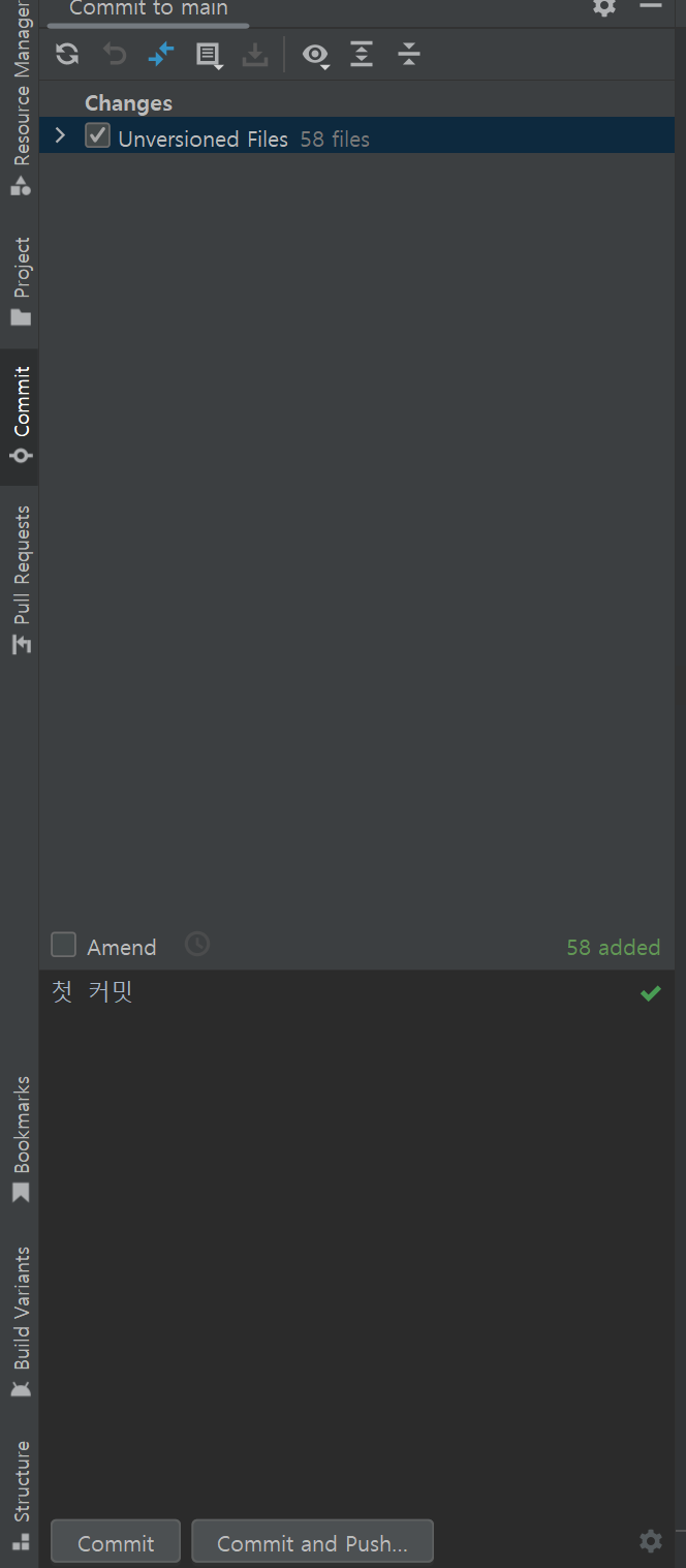 난 옆에 사이드바를 선택해 모든 파일을 체크해 주고 커밋 메시지를 작성해 줬다.