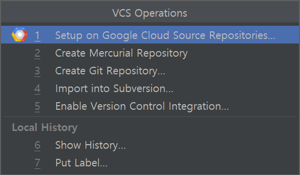 VCS를 사용하기 위해 VCS 메뉴를 선택하면 하위 메뉴를 보면 뭐가 많다.