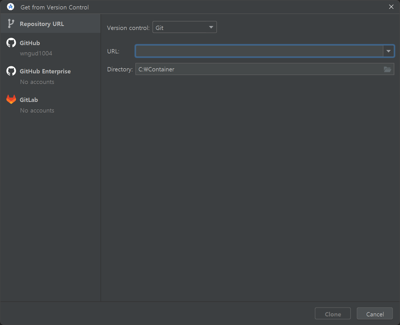 - 프로젝트에 아직 Git 또는 다른 VCS가 적용되지 않은 경우, 이 옵션을 사용해 시작할 수 있다.