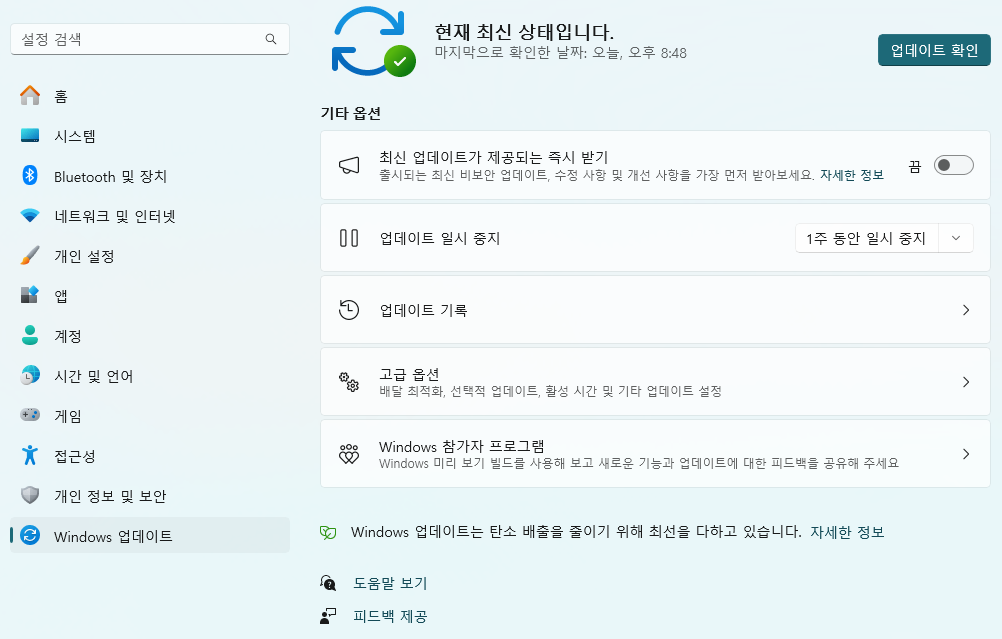 탐색기에 설정을 검색하고 기어 아이콘으로 된 설정에 들어가면 아래 화면이 뜬다.