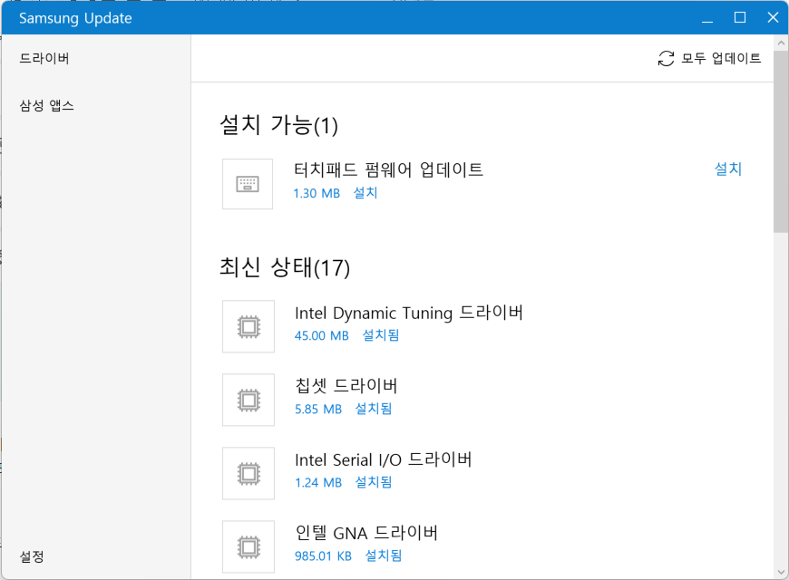 Samsung Update에 들어가 준다. 여기엔 드라이버를 최신 버전으로 업데이트할 수 있다.