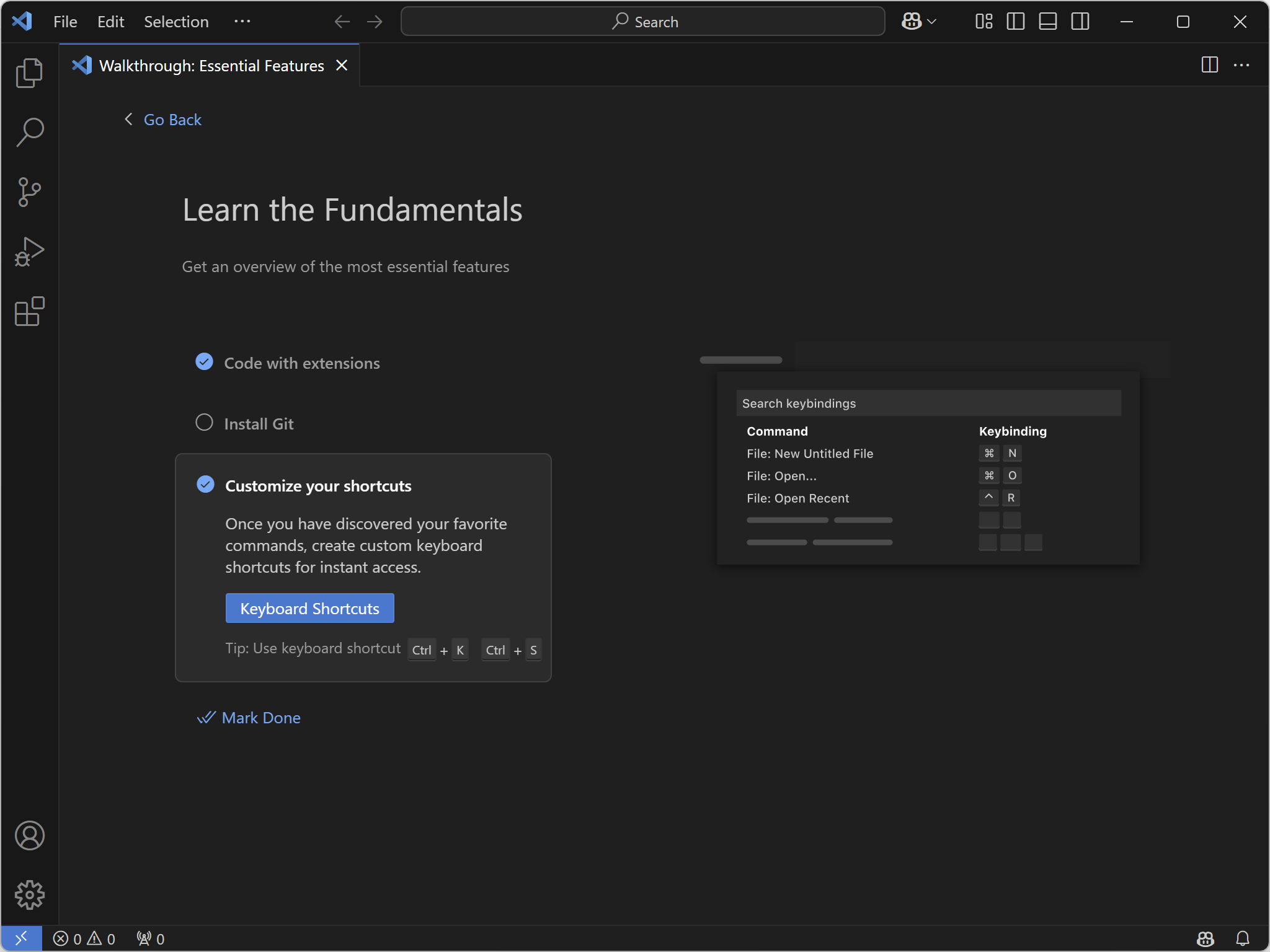 Visual Studio Code를 처음 설치하게 되면 Walkthrough라는 탭이 하나 나온다.