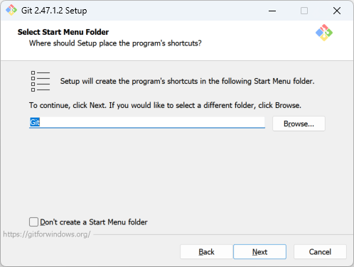 Git 설치 시, Windows 시작 메뉴에 생성될 바로가기 폴더의 이름을 설정한다.