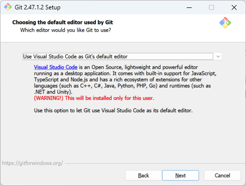 → 추천: 대용량 파일(이미지, 동영상 등)을 다루는 프로젝트가 있다면 선택. 그렇지 않다면 제외해도 상관없다. - Associate .git* configuration files with the default text editor