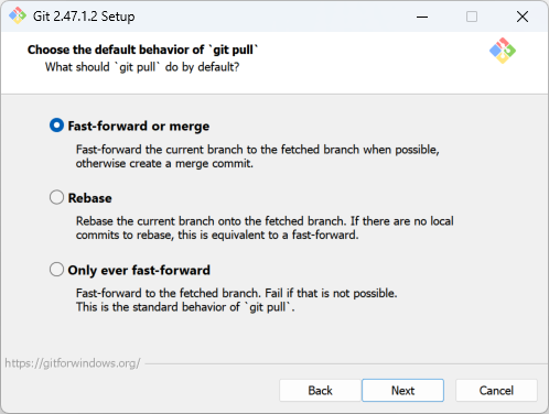 이 화면은 Git for Windows 설치 과정 중 git pull 명령어의 기본 동작 방식을 설정하는 옵션을 보여준다.