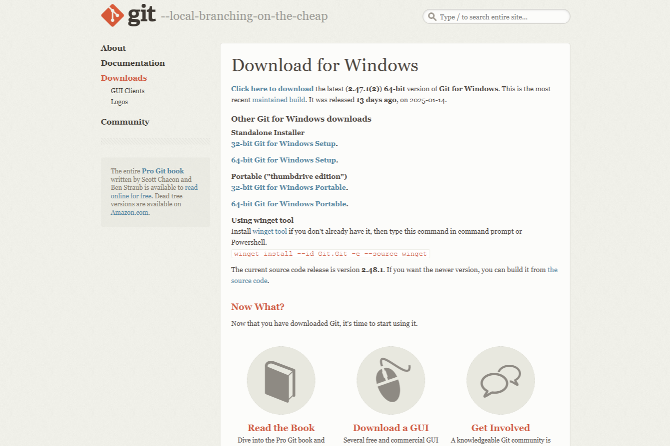가장 맨 위에 있는 Click here to download 는 옆에 설명 그대로 클릭하면 Windows용 Git의 최신(이 글을 쓴 날짜 기준 최신 버전인 2.47.1(2)) 64비트 버전을 다운로드해 준다. 13일 전인 2025-01-14에 출시되었다고 한다.