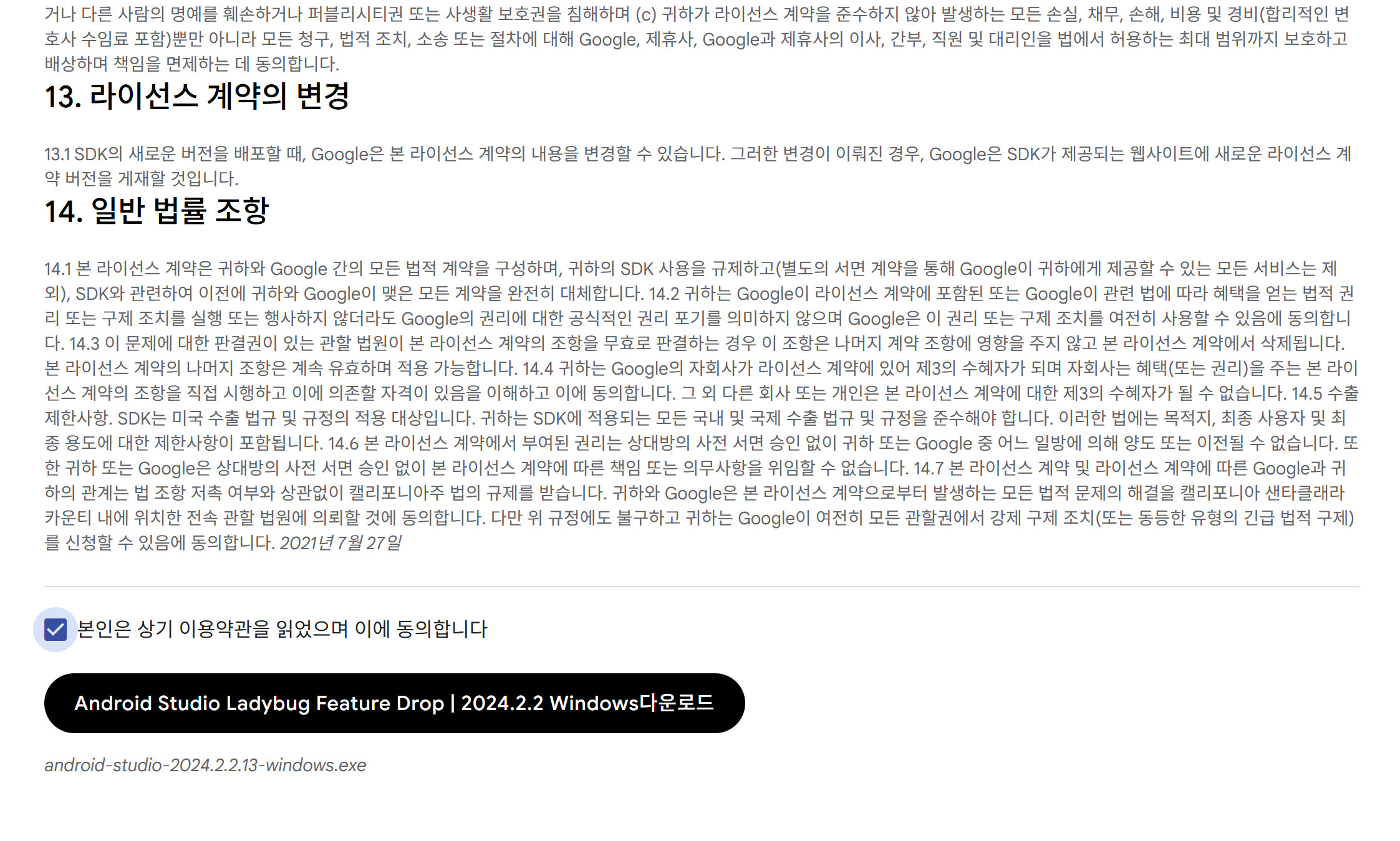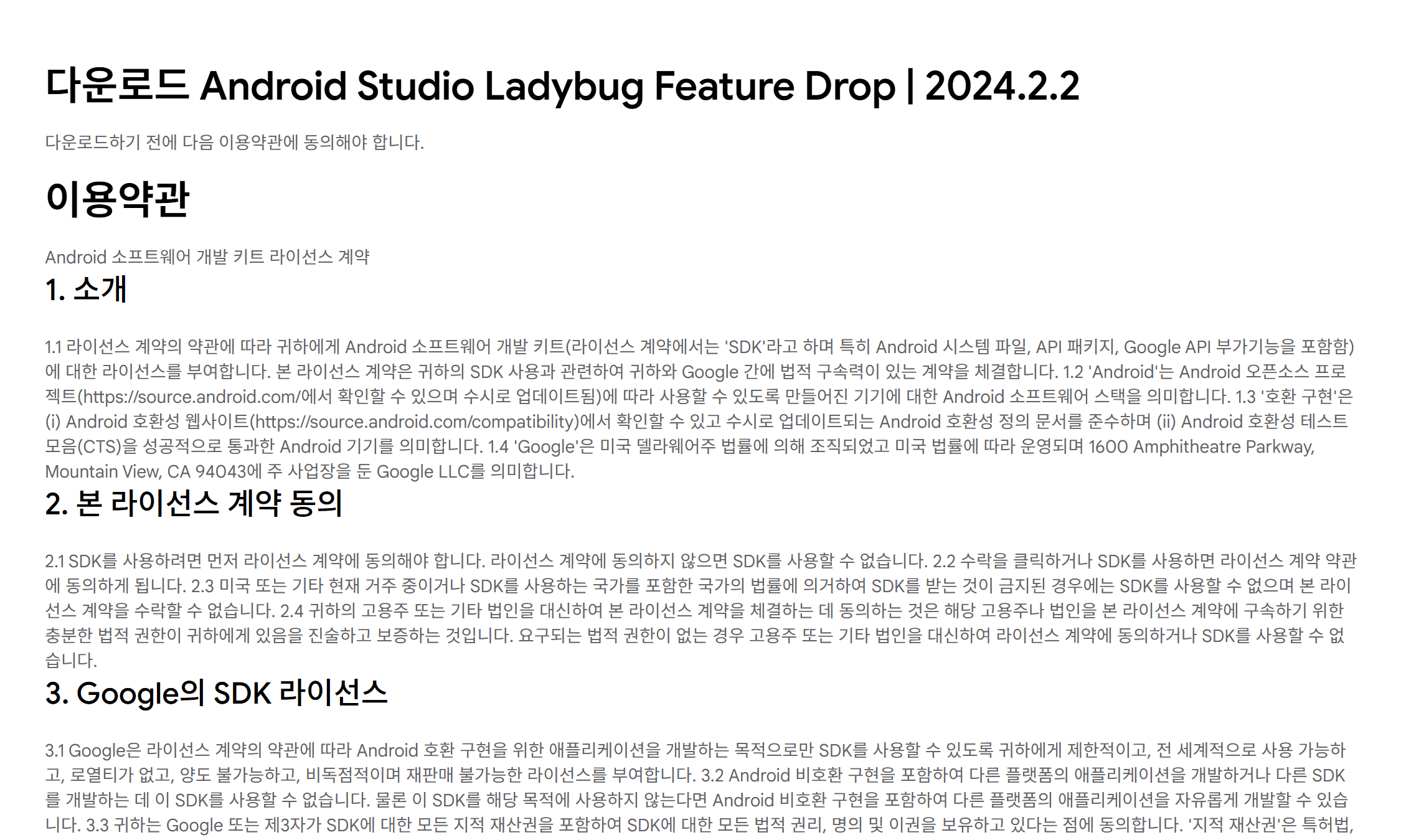 바로 "Android 스튜디오 Ladybug 기능 출시 다운로드" 버튼을 누른다.