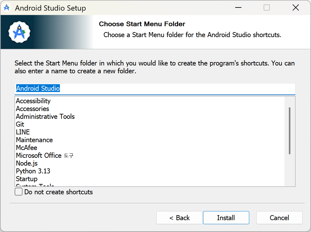 여기서 선택하는 폴더는 Windows 시작 메뉴에서 Android Studio 바로가기를 저장할 위치가 된다.