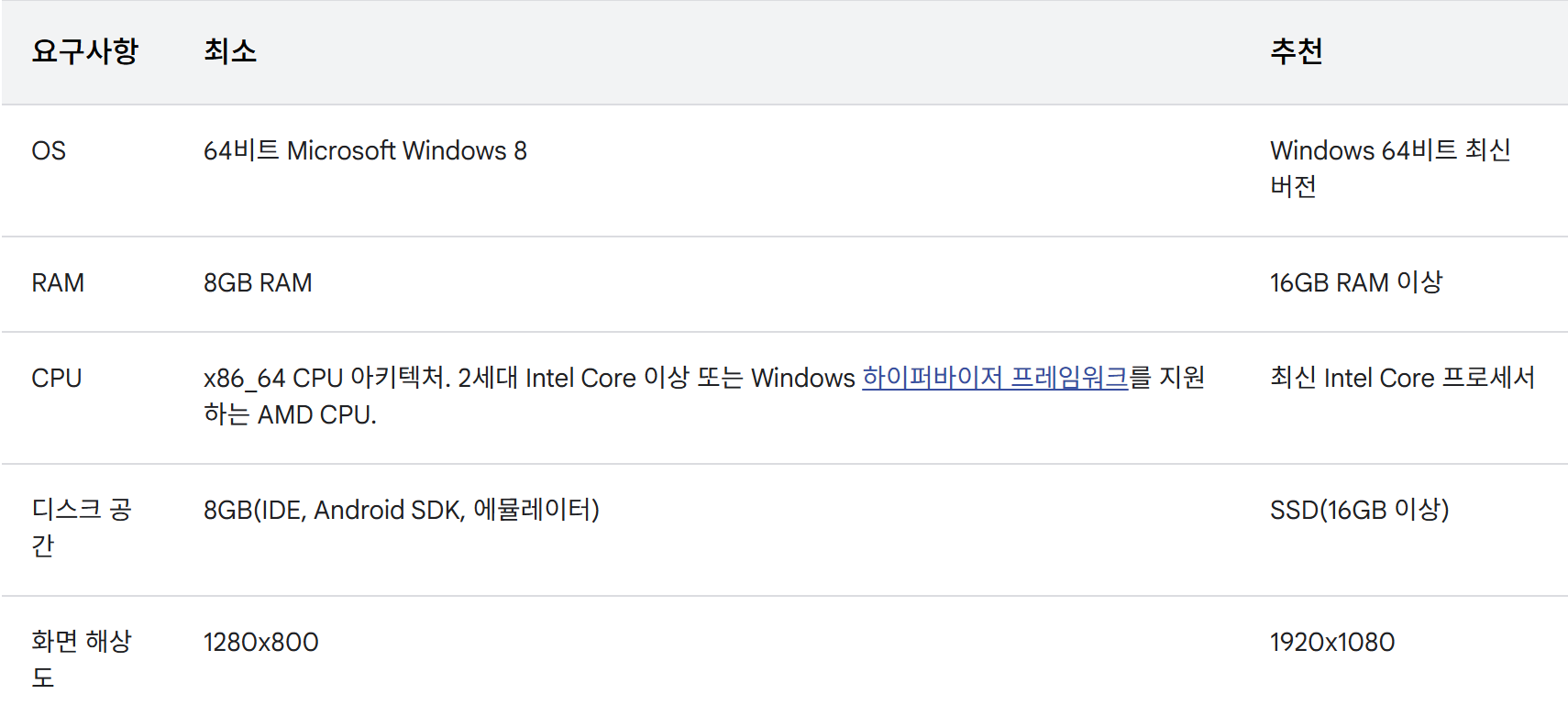 참고로 ARM 기반 CPU를 사용하는 Windows 머신은 현재 안드로이드 스튜디오가 지원되지 않는다.