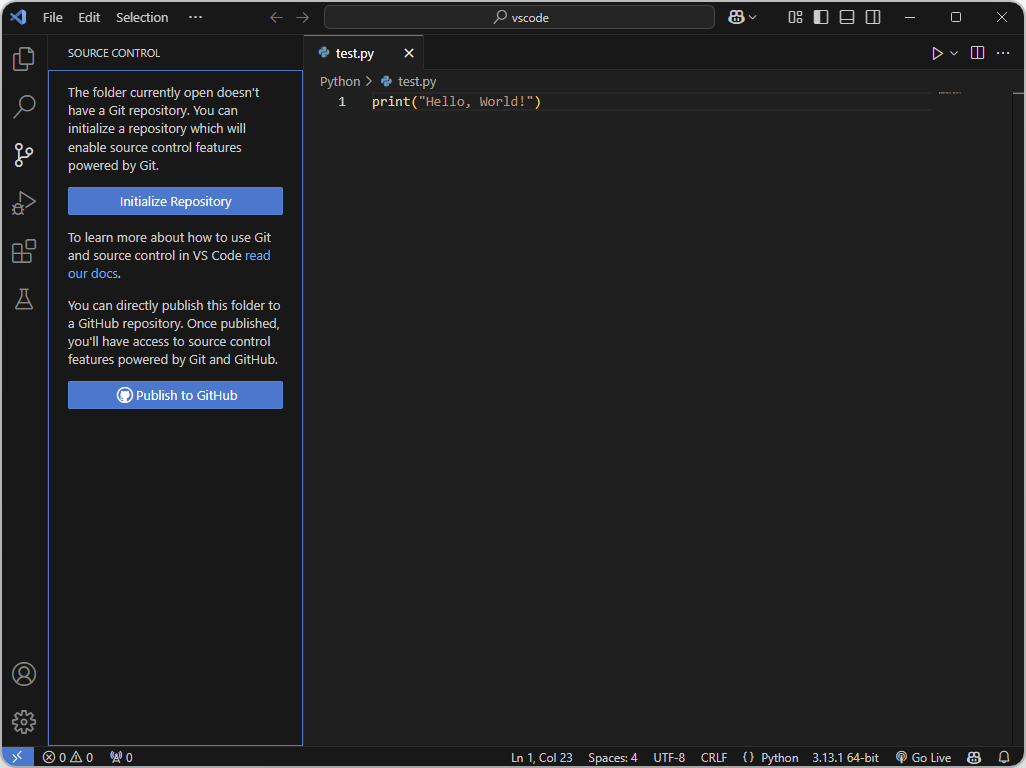 여기서 Initialize Repository를 누르면 Git 리포지토리를 만들고 source control를 사용할 수 있다.